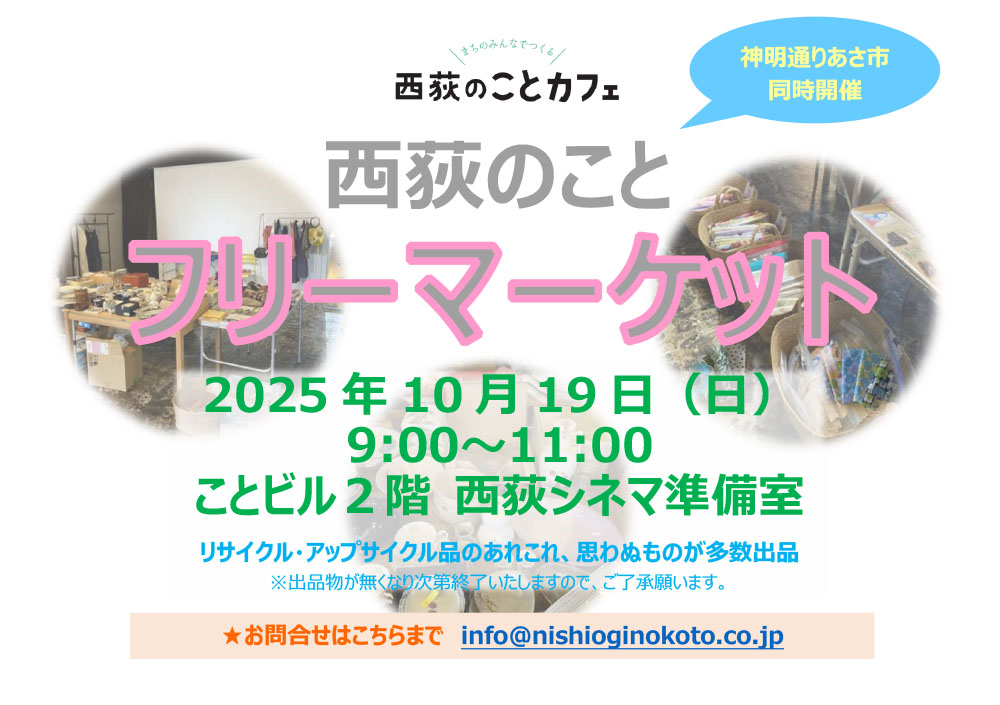 ◯日時:10月19日(日)9:00~11:00◯場所:西荻シネマ準備室(ことビル2階)リサイクル・アップサイクル品、思わぬ掘出し物色々あります!屋内なのでじっくりと出品物をみることができますよ。※注意事項会計は現金(小銭、千円札 ※1万円札はご遠慮下さい。)のみです。paypay、交通系カード等の電子マネー、クレジットカード等はご利用できませんのでご了承下さい。また、駐輪場はございませんので、自転車でお越しの際には近隣の公共駐輪場をご利用下さい。