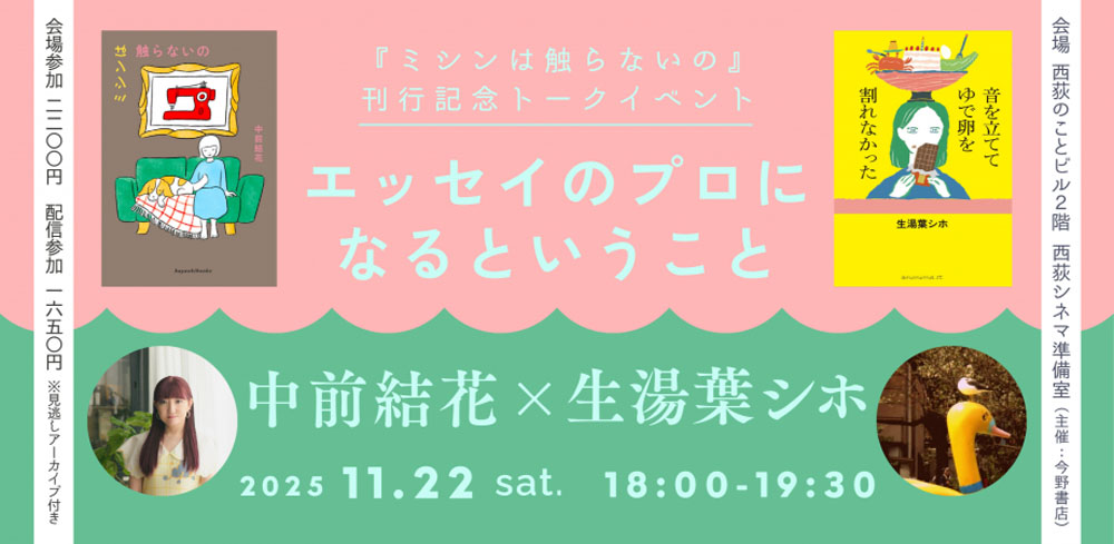 11月222025 『ミシンは触らないの』刊行記念トーク エッセイのプロになるということ 中前結花×生湯葉シホ 『ミシンは触らないの』刊行記念トーク エッセイのプロになるということ 中前結花×生湯葉シホ https://peatix.com/event/4642738/view
