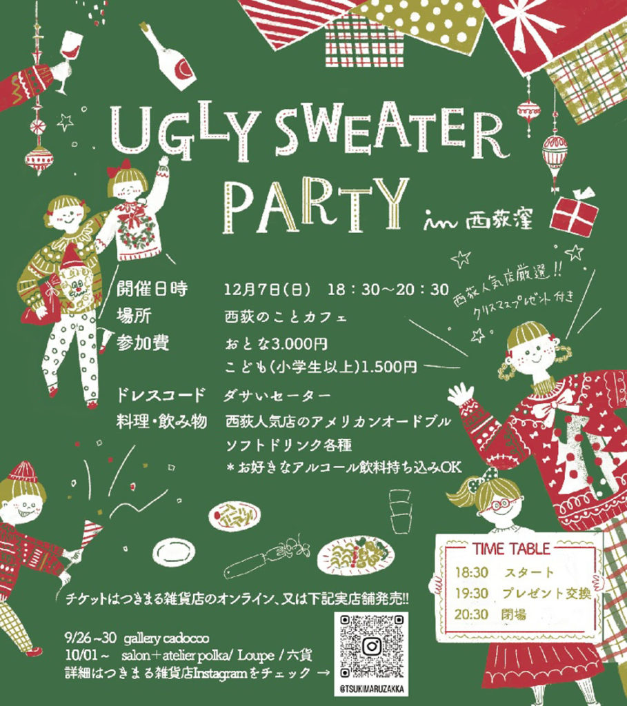 12月072025 UGLY SWEATER PARTY in 西荻窪 UGLY SWEATER PARTY in 西荻窪 ドレスコードはださいセーターのパーティーです。 カフェの営業時間に、ださいセーターの販売をしています。 つきまる印のアグリー良品