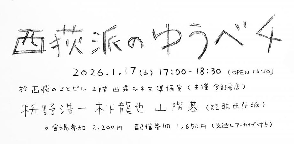 1月172026 枡野浩一×木下龍也×山階基トークイベント 西荻派のゆうべ4 枡野浩一×木下龍也×山階基トークイベント 西荻派のゆうべ4 https://peatix.com/event/4675529/view