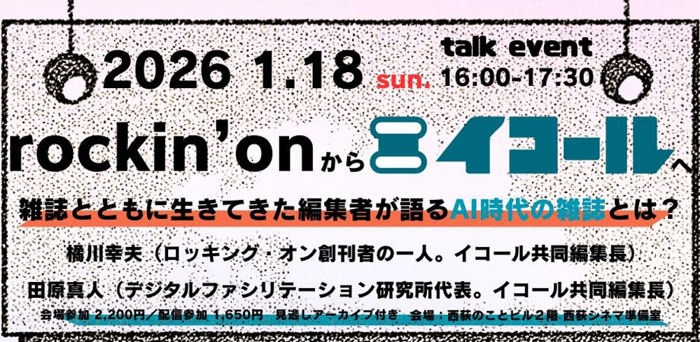 1月182026 「ロッキング・オン」から「イコール」へ: 雑誌とともに生きてきた編集者が語るAI時代の雑誌とは? 「ロッキング・オン」から「イコール」へ: 雑誌とともに生きてきた編集者が語るAI時代の雑誌とは? https://peatix.com/event/4678717/view