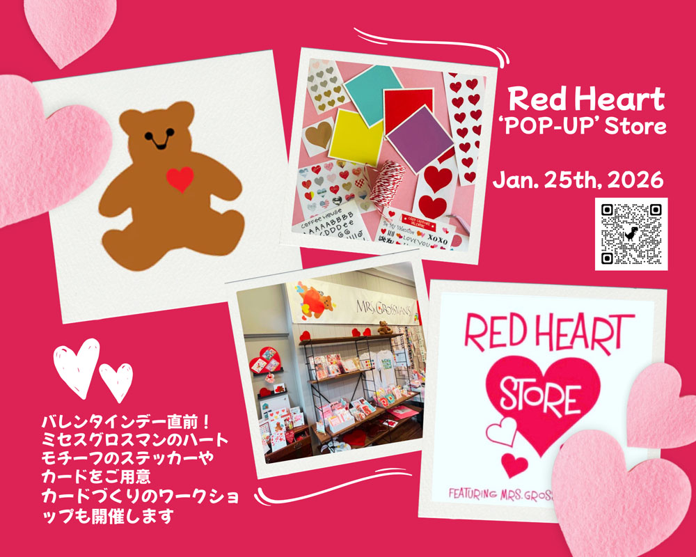 1月252026 Red Heart ‘POP-UP’ Store Red Heart ‘POP-UP’ Store バレンタインデー直前! ミセスグロスマンのハートモチーフのステッカーやカードをご用意。 カードづくりのワークショップも開催します。