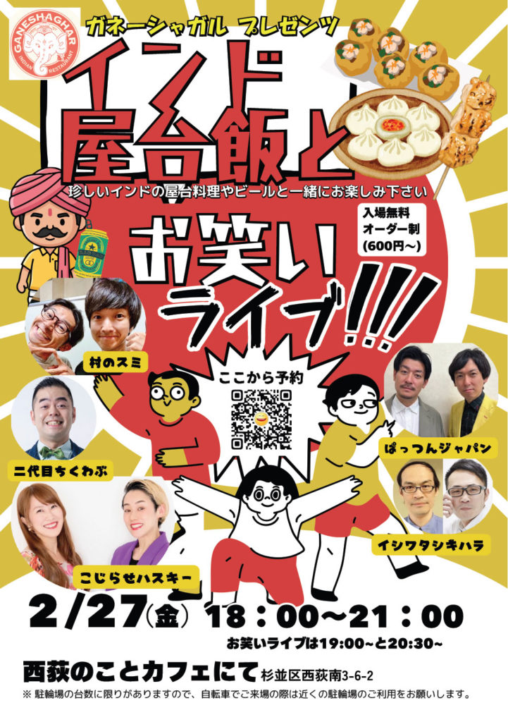 2月272026 インド屋台飯とお笑いライブ! インド屋台飯とお笑いライブ! ガネーシャガル プレゼンツ インドの屋台料理やビールと一緒にお楽しみください。 出演 村のスミ 二代目ちくわぶ ぱっつんジャパン こじらせハスキー イシワタシギハラ