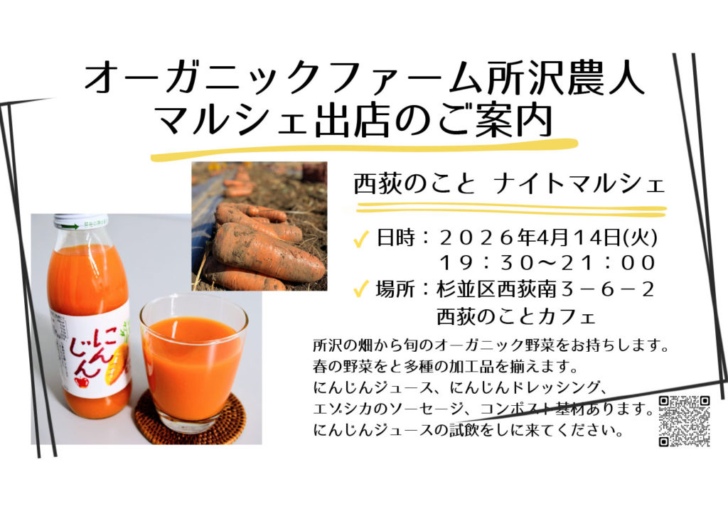 所沢の畑から旬のオーガニック野菜がやって来ます。春ならではの美味しい野菜が勢揃い!加工品もあります!(にんじんジュース、にんじんドレッシング、エゾシカのソーセージ)今回はにんじんジュースの試飲もできるとのことです。コンポスト基材ありますよ。是非、お立ち寄り下さい。